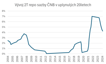 Tento vývoj umožňuje ČNB postupně povolovat „brzdový pedál“, tedy uvolnit svou měnovou politiku právě snižováním své klíčové 2T repo sazby. Ta se od léta 2022 po dlouhých 18 měsíců nacházela na dlouho nevídaných 7 %, od loňského prosince však ČNB svou úrokovou sazbu pozvolně snižuje až na současných 4,25 %. Do konce letošního roku pak můžeme čekat podle všeho 1-2 další snížení po 25 bazických bodech.